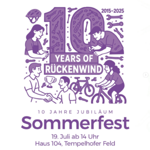 Wir werden 10 Jahre alt – und DU bist herzlich eingeladen! Feiere mit uns ein Jahrzehnt voller Rückenwind: Dich erwartet ein buntes Sommerfest mit leckerem Essen, erfrischenden Getränken, Workshops, Tombola, Siebdruck, Musik und vieles mehr!
