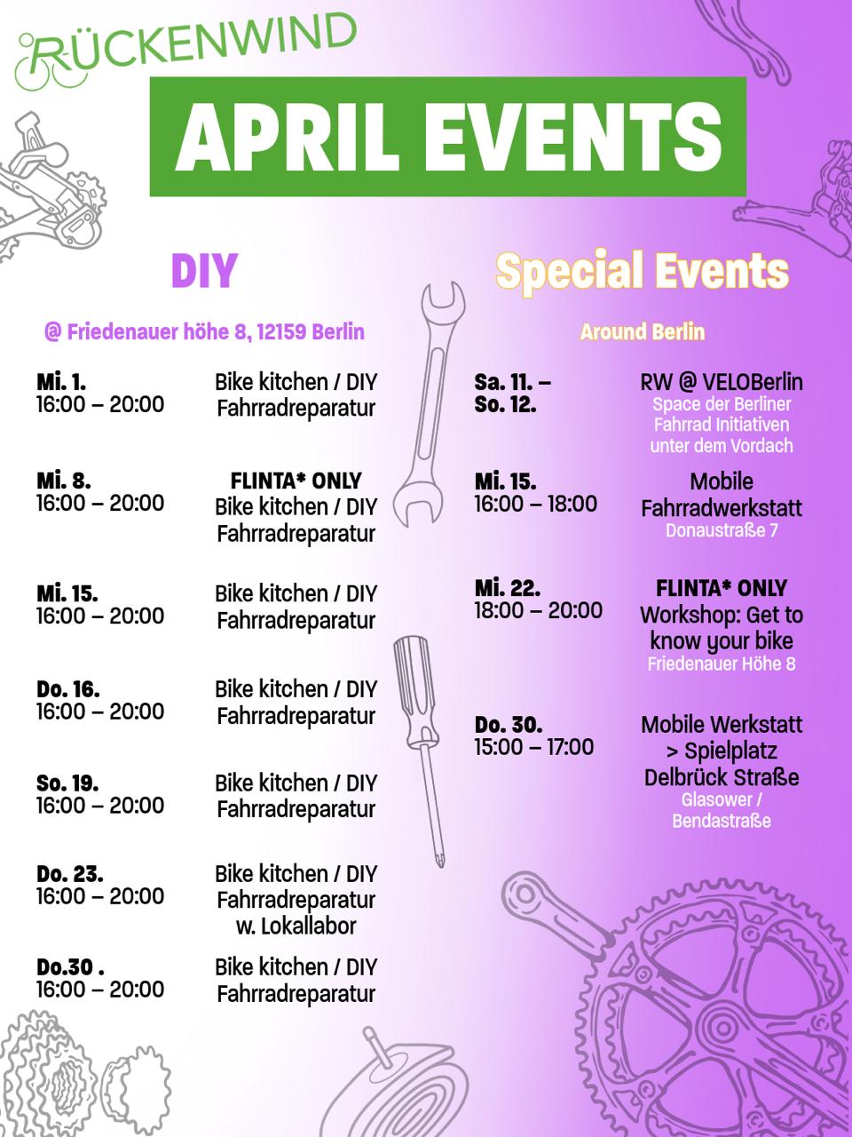 Kommende Events im AprilUnsere mobile Fahrradselbsthilfewerkstatt, BerlinUnsere mobile Werkstatt ist über das Jahr in ganz Berlin unterwegs. Wir sind bei verschiedenen Events dabei, bestimmt auch mal in deiner Nähe!